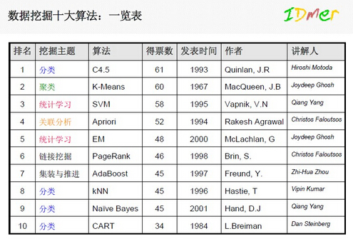 国际权威的学术组织the IEEE International Conference on Data Mining (ICDM) 早前评选出了数据挖掘领域的十大经典算法:C4.5, k-Means, SVM, Apriori, EM, PageRank, AdaBoost, kNN, Naive Bayes, and CART.