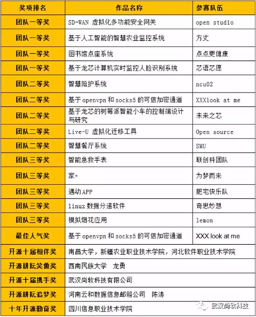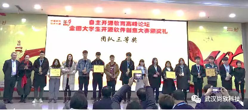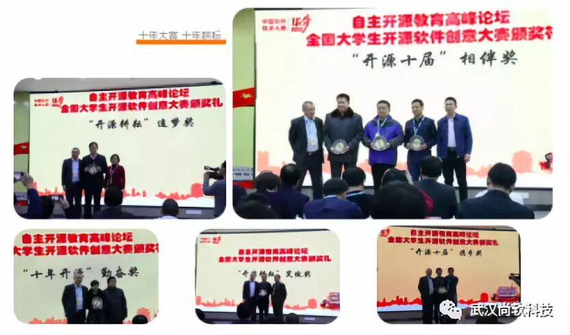 来自各地院校的代表团队以及各界人士齐聚一堂,见证了2018年度14支团队分别收获了一二三等团队奖项,并为本次大赛面向大众公开投票获得票数第一名的团队颁发了网络人气奖。十届的活动,经历了多少坎坷与欢乐,为此特别授予南昌大学、新疆农业职业技术学院、河北软件职业技术学院“开源十届相伴奖”,为坚持积极参与组织策划十届大赛活动的武汉尚软科技有限公司授予“开源十届携手奖”,同时,还为十年来,辛勤耕耘开源,并在参与地区大数据信息化建设服务中所做出的典范贡献的四川信息职业技术学院授予“十年开源勤奋奖”,另外,还借十届大赛庆典之际,特授予二十年来辛勤耕耘开源人才培养,不懈追寻开源事业梦想的西南民族大学龙勇教授“开源耕耘笑傲奖”,河南云和数据信息技术有限公司陈涛先生“开源耕耘追梦奖”,以表彰他们为开源人才培养事业的默默贡献。至此,历时8个月的2018华梦大赛在武汉圆满闭幕。