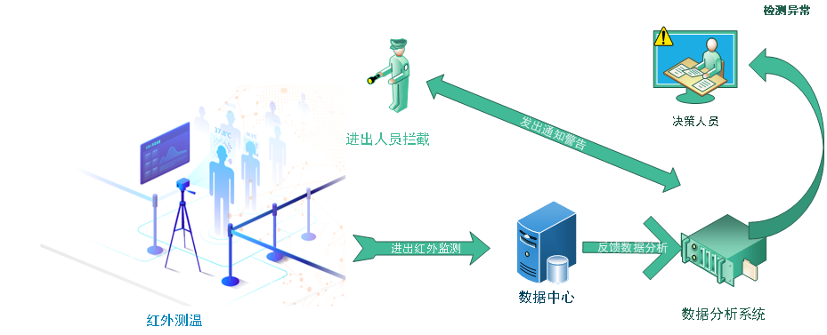 基于在视频/图片智能分析及深度学习技术领域的深入研究,尚软科技安全监控产品2.0方案可实现红外热成像体温监测,远程视频监控,智能可视化调度及异物遮挡检测等多种AI应用,有效解决人口密集度高,逐一检查困难的监测问题。方案通过前/后端智能、红外热成像体温识别+异物检测+人物身份识别多种模式,灵活适应人口密集区域多场景应用,对进出人员体温情况实时分析识别,检测和报警,保障区域安全,为管理人员提供高效安全信息保障。该系统通过前端红外相机,鉴别人流中的高温人员,再根据疑似发烧者的人体、人脸信息,利用人工智能技术辅助工作人员快速定位体温异常者;做到了在佩戴口罩的情况下,也能精准锁定