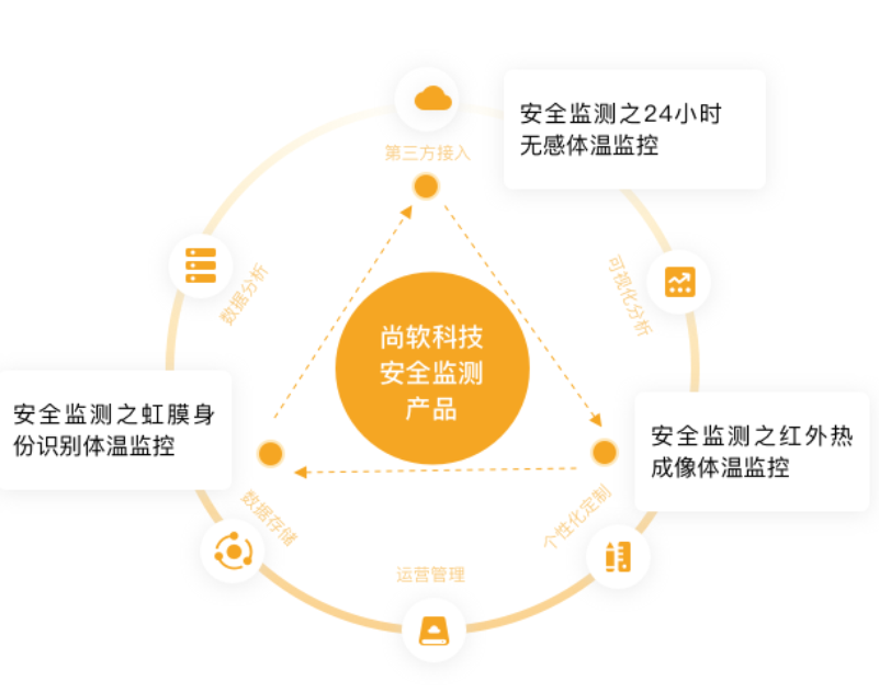 多种物联网感知设备接入能力,满足安全监控不同类型、不同场景、不同联网方式的设备联网、采集上报数据的需求海量设备管理和数据处理能力- 微服务化应用托管和集成能力多种部署形态和云边端一体架构平台提供多种高阶能力的支撑通过科技手段保障个人体温24小时监控在多维度数据分析下判断身体健康情况,尚软科技安全监控产品2.0方案支持24小时在线监测指标涵盖体温,心率、血压、计步、睡眠、血氧、房颤等数据。实时监控是对人体健康情况实时分析的关键指标。无线数据传输(3G/4G/5G)的方式可实现将个人数据实时同步至相关监管部门,确保政企协同管理,满足企业决策分析统计要求,为企业管理决策做依据,突发异常快速响应,企业管理可以快速进行轨迹追踪,筛查疑似接触。以保密安全为标准,对保密安全场合高,需要身份确认的场合,例如保密会议室,安全机关,安全区域,解决面部有遮挡,识别不准确的痛点,方案支持人员虹膜采集、虹膜为人终生不可以改变特征之一,并且眼部无遮挡,方便识别而且精准,安全保密措施有保障。集成数据统计和信息查询,保障管理人员对实际情况全面掌握,实现包括“考勤、门禁、健康监测、智能虹膜、信息发布、数据可视化”在内的全方位智能化管理,有效提高等保要求高的管理。
