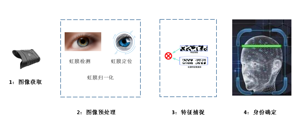 虹膜识别技术可以划分为虹膜图像获取、虹膜图像预处理和虹膜图像特征提取和比对等三大步骤,如下图。