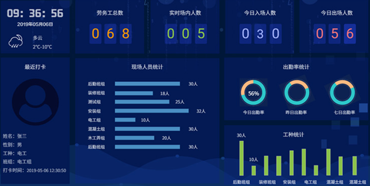 在建筑工人身份识别方面,卡易损坏、遗忘,替代打卡现象时有发生,一线工人指纹和人脸容易磨损或蒙尘,指纹和人脸识别存在识别困难、误识别率高,影响识别效果。虹膜识别不受建筑工地环境限制,且具有唯一性、稳定性、非接触性等特征,无法复制和伪造,在建筑工地身份识别方面优势明显。劳务实名制系统具有项目管理,班组管理,人员管理,合同管理,工资管理,培训管理,设备管理,考勤报表等功能,可将项目信息以及工种班组数据实时显示在LED屏幕或者电视屏幕上,可以第三方劳务平台进行对接。