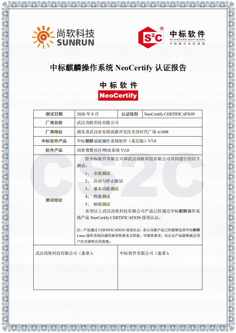近期,坚持自主创新、致力于数字化产品及解决方案的公司武汉尚软科技有限公司(简称:尚软)与中标软件有限公司(中标软件)宣布完成尚软科技2020年度第一批次产品互认证。作为自主创新的数字安全系统v2.0、数字监控手环系统v2.0、智慧物业(社区)系统v2.0,发布中标麒麟操作系统产品 NeoCertify CERTIFICATION 级别认证,系统顺利安装、运行良好,整体稳定。